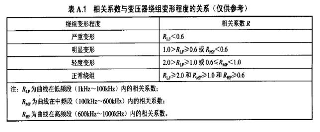 我公司的變壓器繞組變形測(cè)試儀嚴(yán)格按照電力行業(yè)標(biāo)準(zhǔn)DLT911-2004《電力變壓器繞組變形的頻率響應(yīng)分析法》對(duì)變壓器繞組變形程度進(jìn)行分析,具體相關(guān)系數(shù)與變壓器繞組變形程度的關(guān)系見(jiàn)下表: