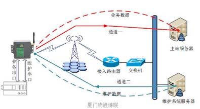 現(xiàn)場采集設(shè)備的業(yè)務(wù)串口與維護串口分別與無線模塊化的串口一和串口二相連。正常通信的時候業(yè)務(wù)數(shù)據(jù)只走通道一,實現(xiàn)配網(wǎng)自動化。當(dāng)需要對采集設(shè)備進行維護的時候維護系統(tǒng)服務(wù)器與無線模塊建立通道二,實現(xiàn)遠程維護的功能。