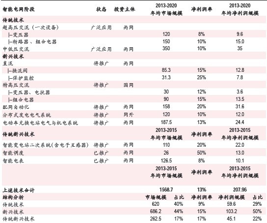 圖表2.智能電網(wǎng)階段新興和傳統(tǒng)新興技術(shù)領(lǐng)域主設(shè)備國內(nèi)市場(chǎng)空間和盈利能力估算(單位:億元)
