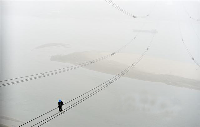 湖北電力檢修工百米高空走電線(xiàn),檢查隱患